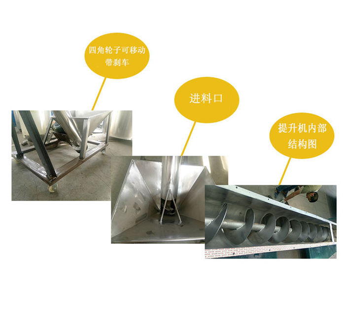 螺旋提升機產(chǎn)品概述該機適用于食品、醫(yī)藥、化工、塑料等行業(yè)的粉粒狀物料的輸送。可以與我司包裝機配套實現(xiàn)料位跟蹤自動供料,也可單獨在其它場合使用。除電機、軸承、機架外其余為不銹鋼制成。可隨意移動,在水平、傾斜、垂直等位置均能連續(xù)輸送,它具有良好的密封性,無粉塵泄漏。可直接與其配套的設(shè)備連接固定,不需要地基基礎(chǔ),充分利用廠房空間。